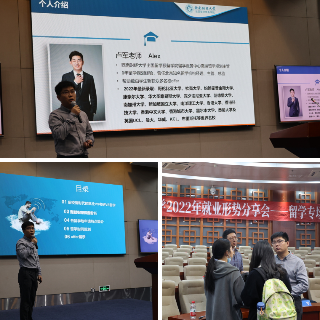 留学服务中心主管卢军老师结合自身九年留学行业经验及现今留学就业形势为同学们带来了包括出国留学及国内研究生对比、各地留学地概况及留学规划和申请材料准备等精彩内容。