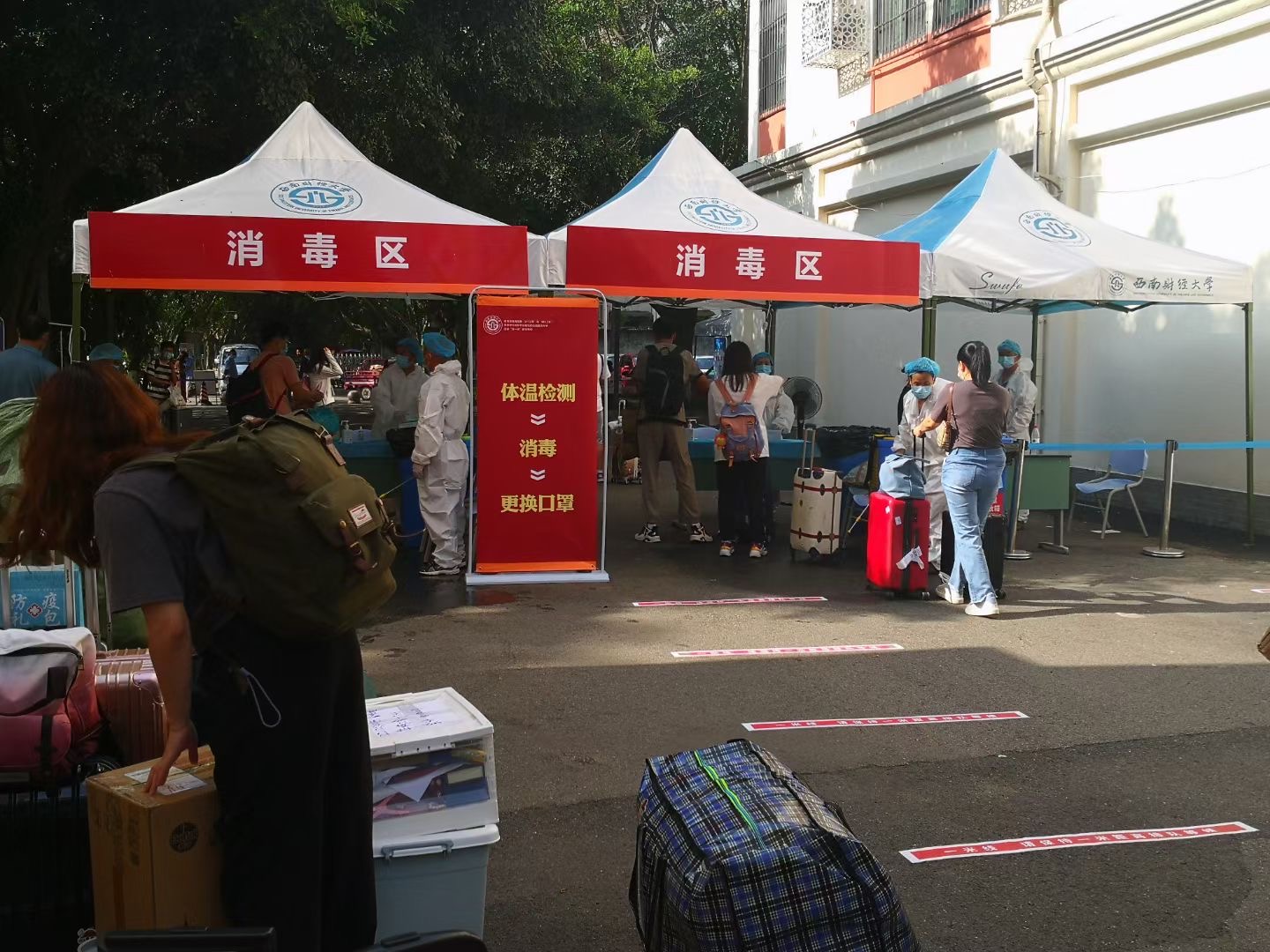 ▲测体温、出示健康码进入消毒区
