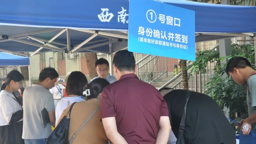 身份确认并签到、领取资料、签订入住协议和安全条例、新生入学须知,整个报到现场秩序井然。同学们陆续来到在线影院