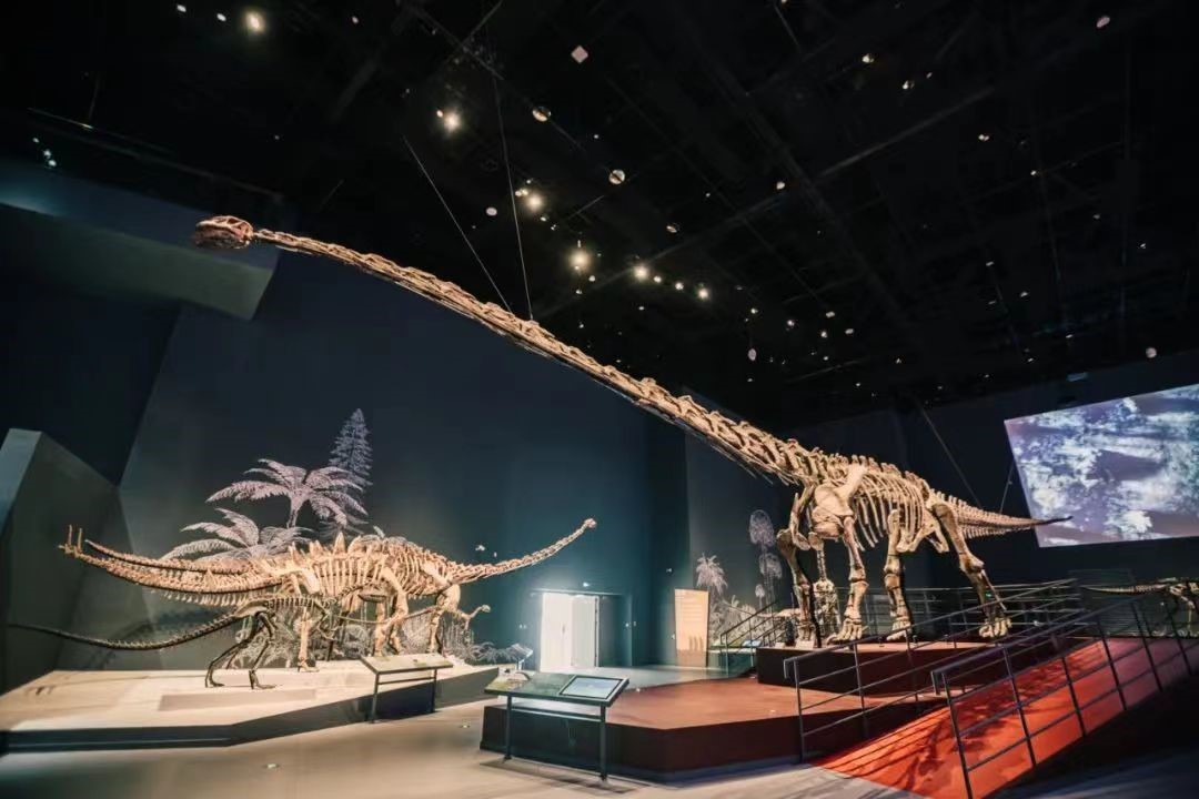 这具恐龙骨架复原全长24米,听讲解员介绍,光脖子就有9米长,是迄今为止亚洲和中国最大的完整恐龙化石。