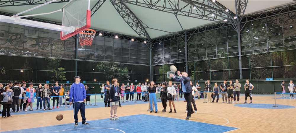 游戏环节,各班班主任和外教老师们与同学们一起进行趣味投篮赛。一个个跃动的身影,快速的奔跑和优美的投篮充分地展现了在线影院